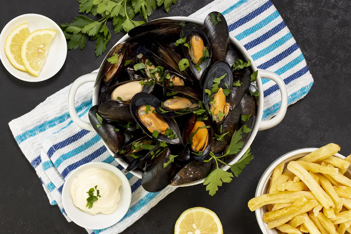 Les moules marinières sont une spécialité des régions côtières françaises, particulièrement de Bretagne, de Normandie et du Nord. Le terme “marinière” fait référence à la sauce marinière (beurre, échalotes, vin blanc, persil), une méthode qui exalte le goût iodé des moules sans le masquer. À la différence des moules à la crème ou farcies, cette version reste fidèle à la simplicité : on laisse parler le produit. La recette traditionnelle se reconnaît à son bouillon parfumé, légèrement réduit, qui invite au mouillage de pain. Un plat convivial par excellence, souvent associé aux frites pour former le duo emblématique “moules-frites”.